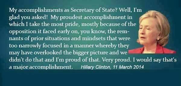 Hillary Clinton’s Accomplishments Posted on January 12, 2016 by ConservativeMe Is it true that she actually said this, its unverified, but other replies to the question though have been just as vague. So it is a simi-accurate reply. She does ramble and say nothing when asked. Share on Tumblr