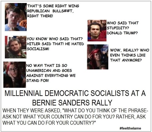 Sanders Supporters Posted on February 25, 2016 by ConservativeMe I can’t say this is true, yet the stupidity of Sanders supporters makes such memes sound truthful. If it is true, it only shows how dumb and ignorant Sanders supporters really are. Share on Tumblr